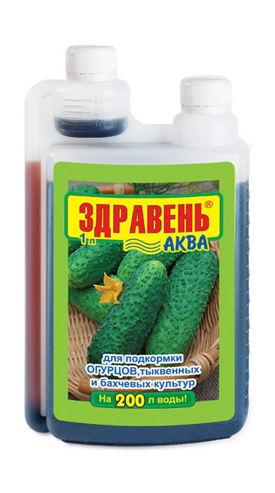 «ЗДРАВЕНЬ-АКВА Огурцы» — жидкое комплексное органоминеральное удобрение для корневых и внекорневых подкормок огурцов, тыквенных и бахчевых культур в личных подсобных хозяйствах.